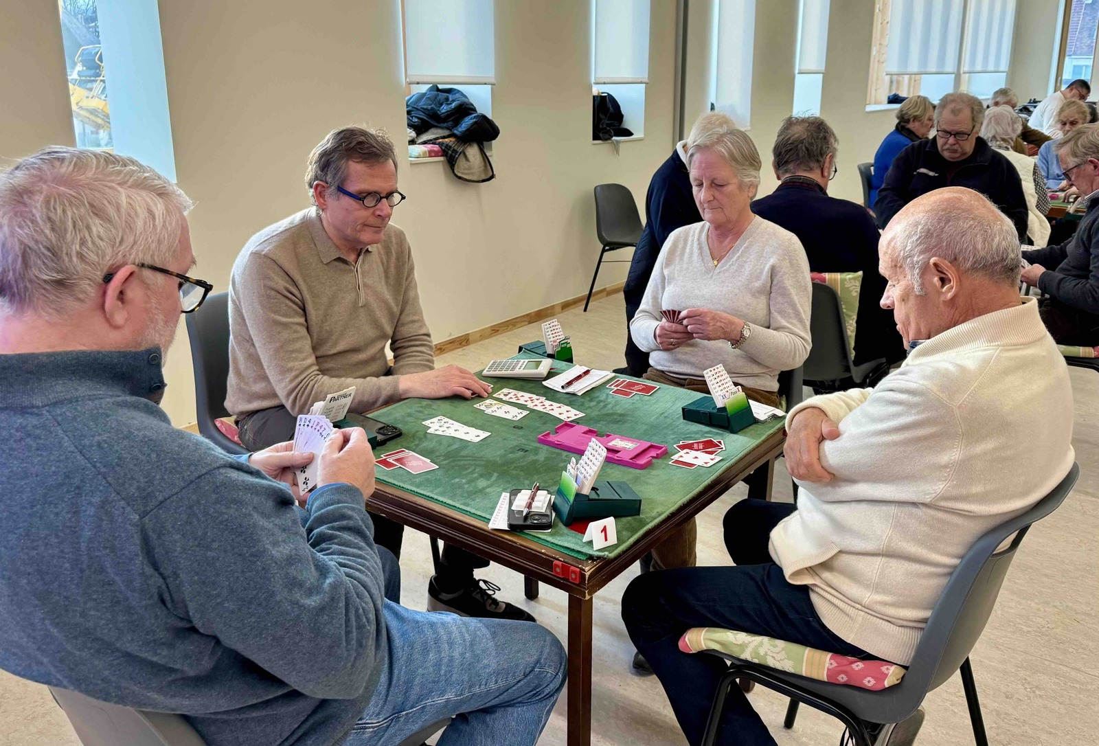 Nous étions 17 tables complètes pour le premier samedi à la maison des associations de Pont l'Évêque. Franck Riehm, Président de la FFB et de la fédération mondiale, Étiennette Choquette, Présidente du Comité de Basse-Normandie, accompagnée de Robert Choquette , Alain Bekerman, Président du Festival de Deauville, Daniel person, Président du club de Deauville et Alain Petit, Président du Joker Club Saint Sauveurais ont participé au tournoi.